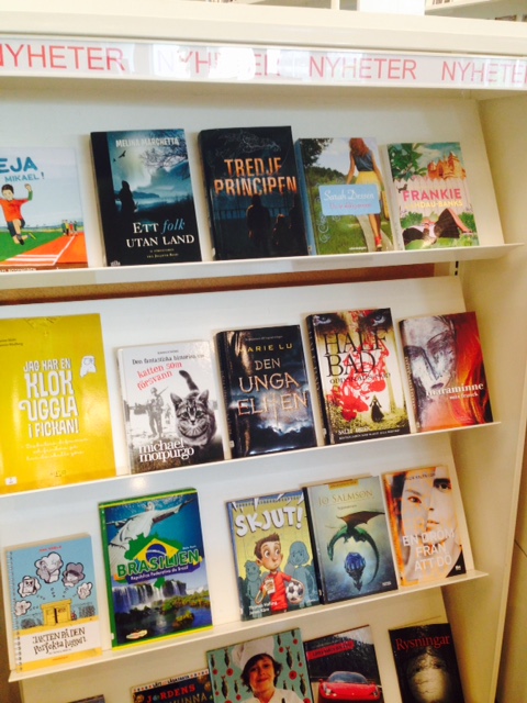 Jag har uppdaterat dåligt på Goodreads ser jag. Läste ut Half bad samma dag jag kom hem med den. 🙂 Och jag gissar vad det blir för triangel och ja, den ser jag också fram emot! Nyheterhyllan på bibblan är givetvis större ( den är egentligen för nyheter och populära ) men jag tog foto på den snyggaste hyllan. 🙂