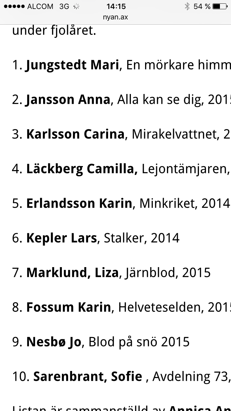 Tidningen Nya Åland presenterade för någon vecka sedan statistiken för de 10 mest lånade böckerna på åländska bibliotek 2015. Den listan ser ut så här,