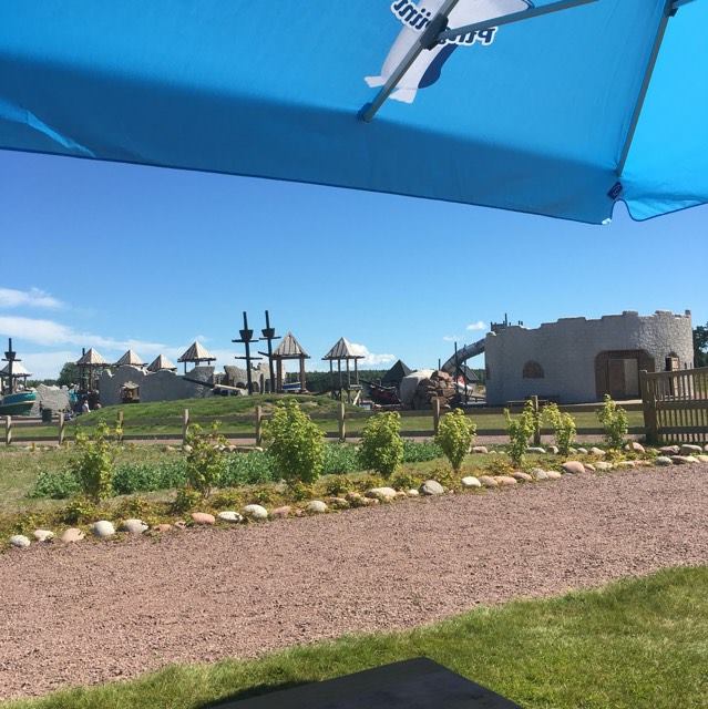 Sedan kommer man tillbaka till början av parken. Här finns en liten karusellpark och sandparadiset för de mindre barnen. Jag och barnen tog det här i slutet vilket visade sig vara riktigt smart. För jag var vid det här laget astrött, så jag bänkade mig med kaffe på uteserveringen där man har uppsikt över både karusellparken och sandparadiset. Medan barnen åkte rutschkana i en traktor…