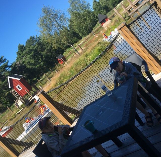Parken är som en bana där aktiviteterna kommer efter varandra ( man kan naturligtvis gå i parken hur man vill ) och längst bort på andra sidan parken finns ett café. Där trodde jag de serverade även lunch eftersom själva restaurangen finns i början/slutet av parken. Och visst serverar cafeet korv med bröd och ett fåtal mackor, men inget annat. Förutom glass och kaffe då. Vi som alla tre var vrålhungriga klämde i oss tre korv med bröd var och det kändes rätt trist. Det känns också onödigt att behöva gå igenom hela parken och äta på restaurangen i början om man sedan ska tillbaka till andra sidan och fortsätta med aktiviteterna där. Jag hade alltså önskat något mer rejält att äta även i caféet.
