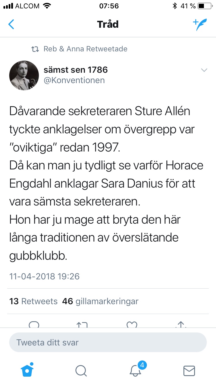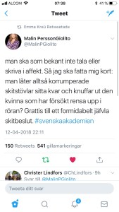 Att Svenska Akademiens visade sig förkroppsliga allt det kvinnorna som vrålat #metoo pekat på. Som Sofia Mirjamsdotter så vältaligt skrev igår,