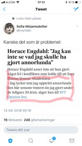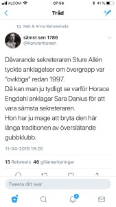 Det är verkligen helt ofattbart. Att det ändå, trots allt, blev en kvinna som fick ta skulden för åratals svineri från gubbväldet i Svenska Akademien. Att en kvinna fick ta skulden för vad alla de tidigare ständiga ( manliga ) sekreterarna medvetet blundat för och låtit fortgå.